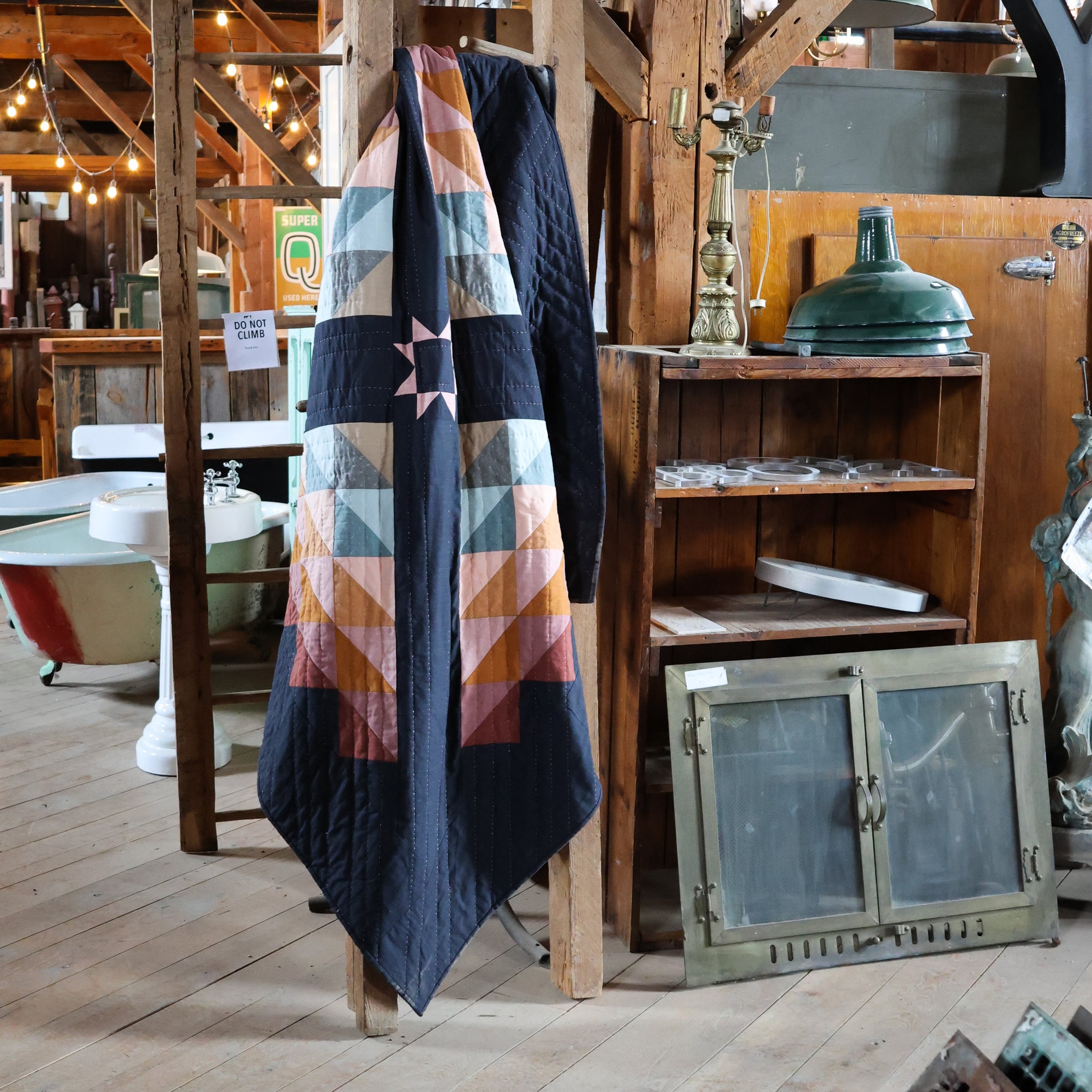 Compared to the original Whistle Stop, this variation pattern adds a central star, larger sashing, and changes the size and number of half square triangles… A modern take on a traditional design. It is called a "variation” pattern because of its similarity to the original Whistle Stop pattern, but is a separate and complete pattern of its own.
