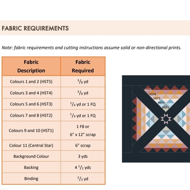 Required Skills: to complete this pattern, the quilter should be able to sew accurate quarter inch seams, 2-at-a-time HSTs, and 4-at-a-time flying geese.